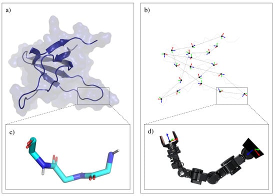 Using the internal coordinate representation described above, proteins can be modeled as articulated mechanisms. The bodies of the mechanism correspond to rigidly-bonded atom groups, and the joints are the bond torsions. The kinematic chains corresponding to the protein backbone and side-chains can then be modeled using standard conventions usually applied in robotics. In this work, we have used the modified Denavit–Hartenberg (mDH) convention []. Following this convention, a Cartesian coordinate system is attached to each rigid atom group. The relative location of consecutive frames in a kinematic chain can be then defined by a homogeneous transformation matrix of the form: