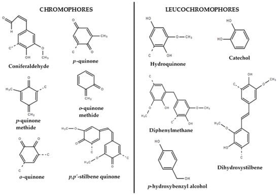 The challenge with colour was recognized as far back as the early 1980s, when a U.S. patent was granted for a process of reduction of lignin colour, which described a two-step chemical process for blocking at least 90% of the free-phenoxyl and hydroxyl groups contained in a lignin, followed by an oxidation, to alter the colour of sulfonated alkali lignins and lignosulfonates [17]. Saritha et al. [18], also showed that native fungi can also be used to biologically decolourize lignin. A 2016 patent application for isolating and manipulating organosolv lignin stated that the colour of lignin cannot be masked in a cost-efficient manner with pigments, especially when light coloured material or products are desired, and this has been the basis for the research to obtain “light” or “white” lignin [19]. More recently, Zhang et al. [20] discovered that the fractionation of lignin by the use of methanol can lead to colour alteration. Since biomass fractionation, lignin extraction and recovery involve formation and/or elimination of multiple-bond functional groups, all unit operations of the lignin production processes have a direct impact on the colour. Although no quantification of the chromophores in lignin has been reported, chromophore formation and transformation during Kraft pulping has been reported by Lachenal et al. [21,22,23] and Dyer [24], but both were from a papermaking perspective and focused on bleaching of cellulosic fibers with low residual lignin content. In addition, it is presumed that the yellowness of lignin rich papers such as those from mechanical pulp, is due to the presence of chromophoric groups such as catechols, aromatic ketones, coniferaldehyde, stilbenes, and conjugated phenolics [25]. Lachenal and his peers have studied the coloured groups involved in Kraft pulp: chromophores arise from either carbohydrate or lignin. Their results suggest that pulp bleachability is greatly affected by the presence of lignin, especially in the form of quinones, which give a reddish hue [23]. Those derived from carbohydrates are easily destroyed by oxidation with conventional pulp bleaching chemicals such as chlorine dioxide. Dyer also reported that the main lignin-based chromophores include carbonyl functional groups, conjugated phenolics, quinoid structures and metal complexes. He also identified some leucochromophores (potential chromophores) that only become converted into chromophores upon oxidation. Figure 2 shows some of the chromophores and leucochrompohores that originate from lignin. A challenge for chromophore quantification is that it is not feasible to distinguish between all the chromophores present in a lignin sample. This is because lignin is a group of complex molecule with a varying number of functional groups and possible reaction sites are present in different ratios; the direct impacts of functional groups interactions as well as the effects of impurities within lignin (e.g., inorganic ones) on luminance have not yet been established.