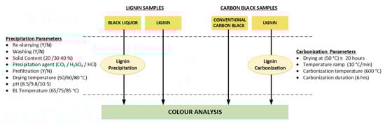 A diagram summarising the types of samples that were produced and analysed in this work is shown in Figure 3. To obtain lignin precipitated from black liquor under different conditions, several parameters were varied as listed in the diagram. This enabled direct comparison with technical lignin samples. It was also necessary to carbonize some lignin samples to benchmark against conventional carbon black. In a similar manner, the carbonization parameters are also provided.