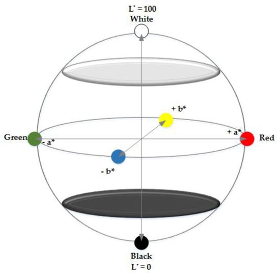 It was necessary to develop a colour measurement analytical method in the framework of this study as none had been reported for lignin. One of the objectives of this work was thus to disseminate this validated method with other researchers, engineers and bio-based product developers that are working at various stages of the lignin valorization chain, to enable communication of results and facilitate discussion. Hence, the detailed protocol is provided in the Appendix section of this paper. Briefly described, all the colour measurements were carried out in triplicate using a HunterLab ColorFlex EZ spectrophotometer that has a 45°/0° reflectance geometry. The standard illuminant (D65) defined by the International Commission on Illumination (CIE) was selected to simulate average daylight [33]. The standard CIE L*a*b* coordinates [34,35,36], as shown in Figure 6, were adopted and average values recorded for each sample as well as the standard deviations.