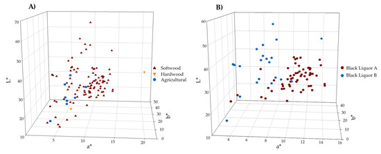 As there is no reference lignin colour, it was necessary to select one colour with which the ΔE00 was calculated. The reference lignin was a commercial Kraft lignin with CIE L*a*b* values of (29; 12; 17). The calculated ΔE00 values for all the samples ranged between 1.4 and 36.6, which means that each lignin has a differentiable colour since the human eye is able to discriminate colours when ΔE00 is higher than 1. The colour variability has also been evaluated in terms of the browning index, which ranged from −107 to 7969. About 3% of the 120 samples had negative values, which implies that this index that was developed for use in the food industry is not generally suitable for all lignins.
