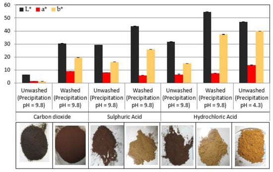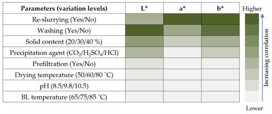A correlation between the changes observed for the different lignins and the factors that have the strongest influence was developed in order to demonstrate the concept that the lignin recovery process can be monitored and controlled using colour measurement. Such a correlation also enables to determine the best strategy for manipulating the lignin colour according to a specific application. This was done by evaluating and quantifying the variations observed in terms of the CIE L*a*b* coordinates. It has to be stressed in this regard that visible colour differences by human observation sometimes do not imply a large shift on the coordinates. The correlation of all the varied conditions with colour is illustrated in Figure 10. The acid-based re-slurrying of the lignin cake during the washing step had the most significant impact on the lignin colour, specifically the blueness (a*) and yellowness (b*) of the samples. This impact was more pronounced than when washed by vacuum filtration. This can be explained by the faster kinetics of reaction. During washing at a pH typically between 1 and 4, protonation of the lignin occurs and the bounded sodium is substituted. In comparison to an unwashed lignin, a brighter lignin is obtained due to the dilution of the cake and/or the displacement of the black liquor that is trapped in the cake. This explains why there is a significant impact on the darkness (L*) of the samples obtained. Washing efficiency and the colour obtained will depend, to an extent, on the shape, porosity gradient and distribution of the pore size. The solid content and the precipitation agent could also be correlated.