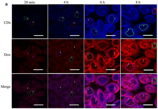 Confocal microscopy demonstrates Dox is released from C-dots-Dox conjugate at 6 h post treatment inside the cell, wherein, the conjugate regains the fluorescent capacity; the scale bar is 20 μm (reproduced with permission from [14]).