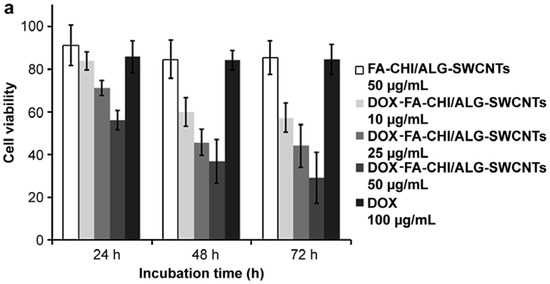 Similarly, success in the use of CNTs for drug delivery has also been demonstrated in several reports [32,34,51]. Certain CNTs may provide excellent fluorescent capabilities or possess some pro-apoptotic capabilities; however, some CNTs may lack stability within a cell. The study by Huang et al. demonstrated a means to overcome such obstacles by encapsulating the CNTs-Dox conjugate within a folic acid-conjugated chitosan, thereby providing increased stability within the cationic chitosan [50]. In a different approach by Satyajit et al., a CNTs drug delivery system was formed by loading with hyaluronan and Dox [51]. The system demonstrated interesting results in their in vivo studies, wherein, some mice given a load of free Dox and another subset were given a load of CNTs functionalized with PEG to form a CNTs-hyaluronan-Dox conjugate system. Mice given the drug delivery system showed no outward changes and had remarkably reduced toxicity; by comparison, mice treated only with Dox demonstrated higher levels of toxicity, weight loss, and sluggishness. This demonstrated the potential of CNTs in improving drug efficacy and quality of life. In the same vein CNTs conjugated to Dox and inserted into folic acid attached chitosan at 50 μg/mL were able to decrease tumor cell viability the same degree compared to 100 μg/mL of Dox alone (Figure 3a) [34]. Improved apoptosis is visible and can be seen from Figure 3b,c within the free drug and drug delivery vehicle, respectively. The wide array of published papers indicate Dox as a flexible and potent anti-cancer agent with the ability to cause cellular apoptosis in nearly any cancer cell line and allow for a timely target delivery.
