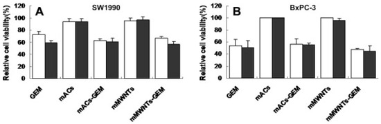 Cell viability in SW1990 cells (A) and BcPC-3 cells (B), when treated with magnetic multi-walled carbon nanotube (MWNTs)-Gem conjugates and magnetically activated carbon particle (mAC)-Gem conjugates show similar results as free Gem alone at concentrations of 1 ug/mL and 2.5 ug/mL respectively (reproduced with permission from [52]).