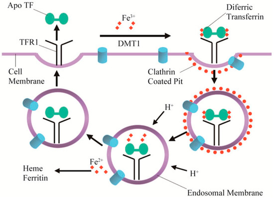 Diferric transferrin binds to transferrin receptor 1 at the cell surface, and the complex is endocytosed using clathrin-coated pits. Iron is released from transferrin and transported out of the endosome through divalent metal transporter 1 into the cytosol. Apotransferrin and transferrin receptor 1 return to the cell surface where they dissociate at neutral pH and are available for another iron cycle (reproduced with permission from [86]).