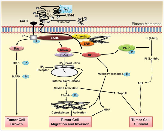 CD44 receptor binds hyaluronan (HA) causing a signaling cascade outlines above and eventual endocytosis (adapted with permission from [104]).