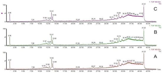 UPLC-QTOF-MS total ion current chromatogram of a methanol extract of Rhizoma coptidis (A), ginger juice-processed Rhizoma coptidis (B) and water-processed Rhizoma coptidis (C).