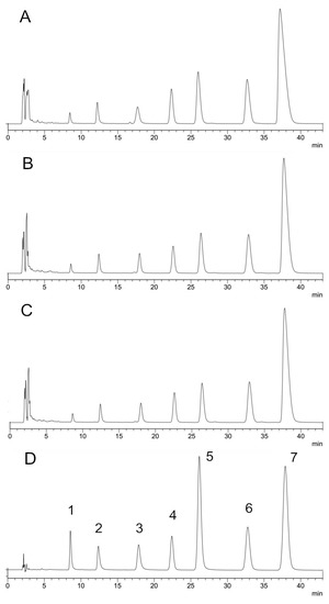 HPLC chromatogram of methanol extract of Rhizoma coptidis (A), ginger juice-processed Rhizoma coptidis (B), water-processed Rhizoma coptidis (C), and the mixture of reference substances (D). 1. Groenlandicine 2. Jatrorrhizine 3. Columbamine 4. Epiberberine 5. Coptisine 6. Palmatine 7. Berberine.