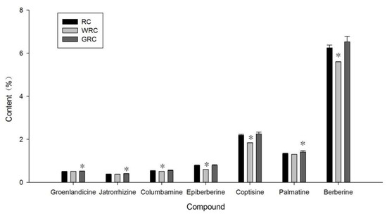 Seven alkaloids content of Rhizoma coptidis (RC), water-processed Rhizoma coptidis (WRC) and ginger juice-processed Rhizoma coptidis (GRC). Values are means ± SD, n = 3. * p < 0.05 of processed RC against RC.