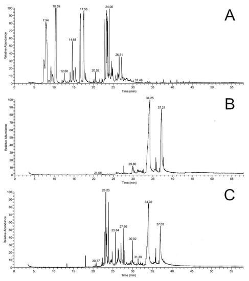 The qualitative analysis of volatiles was conducted on a Trace GC ULTRA gas chromatograph (Thermo Scientific, Waltham, MA, USA) directly coupled to an ISQ Single Quadruple MS (Thermo Scientific). The volatiles were separated using an Agilent J&W DB-5 column (30 m × 0.25 mm × 0.25 μm). The oven temperature program was as follows: 50 °C (held for 3 min), then raised to 300 °C at a rate of 5 °C/min (held for 5 min). Helium was used as the carrier gas at a flow rate of 1.0 mL/min. The MS fragmentation was performed by electronic impact (EI) at 70 eV, a source temperature of 300 °C, scanning times of 0.2 s, and a mass acquisition range of 35–800 amu. All compounds were also confirmed by the matching of their mass spectra with the NIST 2.0 mass spectral database (National Institute of Standards and Technology, Gaithersburg, MD, USA). Also, the retention indices were calculated for all volatile constituents using a homologous series of n-alkanes.