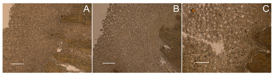 The microscopic image of Rhizoma coptidis (A), ginger juice processed-Rhizoma coptidis (B) and water-processed Rhizoma coptidis (C) slices. Scale bar: 50 μm.
