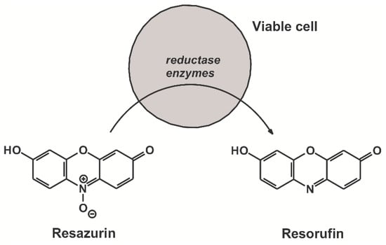 Resazurin (7-hydroxy-3H-phenoxazin-3-one 10-oxide) also called Alamar Blue is a dye commonly used for measurements assaying cell viability [1,2,3]. Resazurin itself is weakly fluorescent; however, its reduction by bacteria or mammalian cells results in a pink and highly fluorescent derivative resorufin (7-hydroxy-3H-phenoxazin-3-one) that is formed (Figure 1) [4]. Resorufin in turn can be reduced further into the colorless and non-fluorescent hydroresorufin [5]. The resazurin assay is applied commonly to investigate antibiotic resistance of some bacteria (e.g., Mycobacterium strains), to test the antibacterial action of various compounds, or even to examine bacterial biofilm formation [6,7,8]. On comparing with other assays testing cell viability, the resazurin-based assay appears suitable and reliable for investigating the toxic effect of various compounds on mammalian cells [2,9,10]. Based on previous studies, there is a direct correlation between the reduction of resazurin and the number/proliferation of bacteria or mammalian cells [5]. The resazurin or Alamar Blue assay is used commonly for testing cell viability because its cost is low, and we do not need to extract the cells, owing to the much lower cytotoxicity of resazurin and its derivatives than of the reagents employed in other assays, including the commonly applied MTT assay [5]. Resazurin assay itself is a simple and rapid method to test cell viability. Resazurin solution is added to the cells in a volume corresponding to 10% of the medium (without replacing the medium), and then the conversion to resorufin can be measured by either colorimetry or fluorimetry. Nevertheless, fluorimetry appears more sensitive compared to the colorimetric analysis [5]. The fluorescence excitation and emission maxima of resorufin are approximately at 570 nm and 585 nm, respectively [11]. However, during the resazurin-based viability assay, the fluorescence of the formed resorufin is determined in the samples using 530 to 580 nm as excitation and 570 to 620 nm as emission wavelengths [3,10,12].