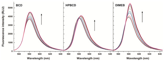 First, the concentration dependent effect of CDs on the fluorescence signal of resorufin was examined at 25 °C. Therefore, increasing concentrations of BCD, HPBCD, and DIMEB (0–1200 μM) were added to a fixed concentration of resorufin (0.4 μM) in phosphate-buffered saline (PBS, pH 7.4). Fluorescence emission spectra were recorded using 570 nm as excitation wavelength (this wavelength proved the excitation maximum of resorufin; see in Figure S1). As Figure 2 demonstrates, the fluorescence signal of resorufin increased in the presence of each CD in a concentration dependent fashion. The strongest fluorescence enhancement of resorufin was observed with DIMEB, while in the presence of BCD and HPBCD, the fluorescence enhancement was weaker. Furthermore, a red shift of the emission maximum of resorufin was observed in the presence of each of the three CDs (HPBCD > DIMEB > BCD). Under the applied conditions, CDs alone did not express any fluorescence signal; therefore, it is reasonable to hypothesize that the fluorescence enhancement of resorufin by CDs is ascribable to the host-guest type complex formation of the examined compounds. The microenvironment within the cyclodextrin cavity is less polar than in water; its dielectric properties are close to those of 70% v/v ethanol-water mixture. The fluorescence signal of a fluorophore is strongly influenced by polarity of the environment around the molecule. In the CD nanocavity, the fluorophore is surrounded by apolar microenvironment, thus affecting its fluorescence due to the molecule being entrapped by the CD. Based on these principles, complex formation of a fluorophore with a CD is commonly associated with the increase of its fluorescence signal [25,26]. Furthermore, the methylation of BCD has two consequences: (1) the cavity depth is extended in both primary and secondary side of the cyclinder, which becomes taller, while cavity diameter is unchanged and (2) self-assembly-related poor aqueous solubility of parent BCD is dramatically improved by methylation (intermolecular H-bond formation is disrupted by methyl groups).