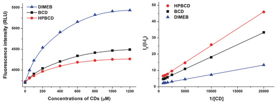 Fluorescence emission intensities (left) of resorufin (0.4 μM) in the presence of increasing β-cyclodextrin (BCD), hydroxypropyl-β-cyclodextrin (HPBCD), and heptakis-2,6-di-O-methyl-β-cyclodextrin (DIMEB) concentrations in PBS (pH 7.4; left). Benesi-Hildebrand plots of resorufin-CD complexes (right; λex = 570 nm, λem = 583 nm) (RLU = relative light unit).