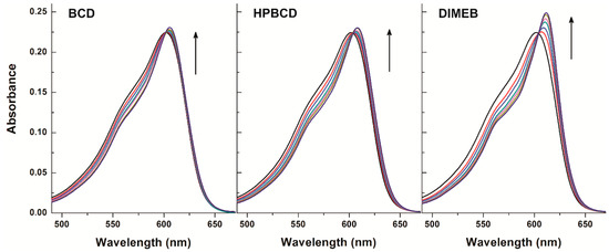 Absorption spectra of resorufin (4 μM) in the presence of cyclodextrins (CDs) added at concentrations 0, 100, 250, 500, 1000, 1500, and 2000 μM in PBS (pH 7.4).