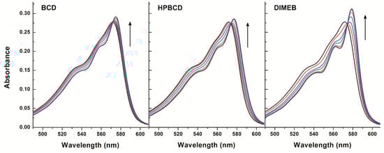 To confirm the calculated binding constants of resorufin-CD complexes (determined from the data of fluorescence spectroscopy; see in Section 2.1) as well as to investigate the possible formation and stability of resazurin-CD complexes, absorption spectra of resorufin and the parent compound resazurin were recorded in the presence of CDs at 25 °C. CDs (0–4000 μM) were added to a fixed concentration of resorufin or resazurin (both 4 μM) in PBS. The absorbance values of both resorufin and resazurin increased together with the increasing CD concentrations (Figure 5 and Figure 6, respectively). Importantly, CDs alone (that is, without resazurin and resorufin) did not have any absorbance at the applied concentrations (data not shown), indicating that the abovementioned increase in the absorbance is most likely due to the interaction of resazurin or resorufin with CDs. In addition, not only absorbance increase but also a slight red shift of the absorption maxima was observed (Figure 5 and Figure 6). These findings suggest that resorufin and resazurin are able to form complexes with CDs.