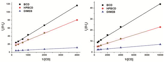 The fluorescence of the resorufin-CD complexes was significantly stronger than that of the dye molecule in its free form. Based on the enhanced fluorescence of resorufin in the presence of increasing CD concentrations (Figure 3, left), the binding constants of the formed complexes were calculated employing the graphical application of the Benesi-Hildebrand equation (Equation (1)). Benesi-Hildebrand plots of resorufin-CD complexes were linear and correlated with the 1:1 stoichiometry model well (Figure 3, right). The calculated binding constants of the tested resorufin-CD complexes indicated similar stability values; however, HPBCD and DIMEB formed more stable complexes with resorufin compared to the native BCD molecule (Table 1). Our results are in good agreement with the previously published data of Balabai et al. [21], where similar logK value of resorufin-BCD complex (logK = 3.3) and 1:1 stoichiometry of complex formation were reported.