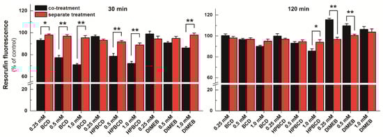 Resazurin-based cell viability assay on HepG2 cells. The cells were incubated with cyclodextrins (CDs) together with resazurin (black bars) or with CDs followed by resazurin (red bars) for 30 min (left) or 120 min (right). Bars represent mean ± SEM of five independent experiments, based on the measurement of resorufin (* p < 0.05, ** p < 0.01).
