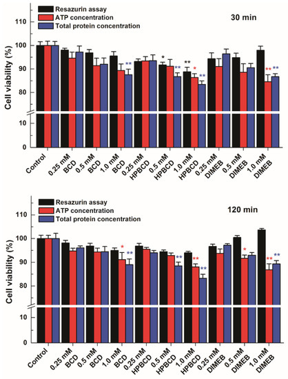 CDs can enhance the aqueous solubility of lipophilic molecules and/or enhance their cellular uptake; therefore, the biological action of CD complexes with different compounds or the cellular uptake of encapsulated guest molecules are commonly tested in cell experiments [32,33,34]. Because the stability of these CD complexes are typically low, micromolar concentrations of guest molecules should be accompanied by millimolar CD concentrations for achieving encapsulation of the guest at considerable level. Furthermore, CDs (mainly methylated derivatives) are commonly used for manipulate cellular cholesterol content or for extraction of cholesterol from cell membranes [35,36,37]. During the above-listed experiments, the effects of the encapsulated test compound and of the applied CD on cell viability need to be tested as well. Since resazurin is a widely used cell viability assay dye, there is a rational chance that researchers choose resazurin to evaluate cell viability.