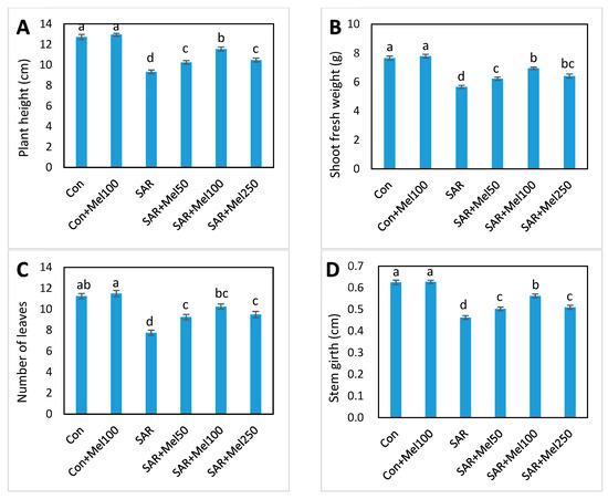 Changes of plant growth parameters in tomato plants by SAR and/or melatonin treatments. (A) plant height; (B) fresh weight of shoot; (C) number of leaves; (D) stem girth. Data indicates here the mean of four replications. Vertical bars indicate the standard error. Means not sharing a common letter within the graph are significantly different at p ≤ 0.05 according to Turey’s test.