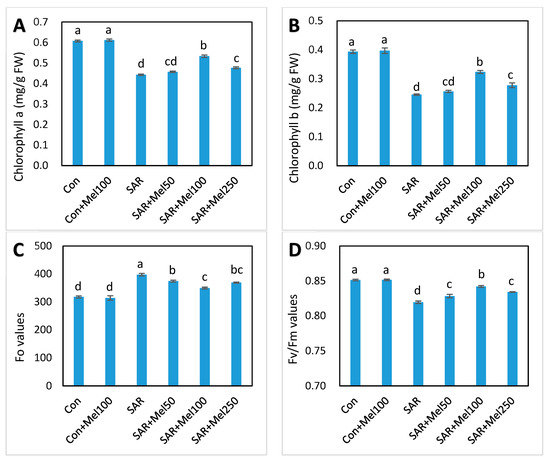 Changes of photosynthesis activities in tomato leaves by SAR and/or melatonin treatments. (A) chlorophyll a; (B) chlorophyll b; (C) Fo values; (D) Fv/Fm values. Data indicates here the mean of four replications. Vertical bars indicate the standard error. Means not sharing a common letter within the graph are significantly different at p ≤ 0.05 according to Tukey’s test.