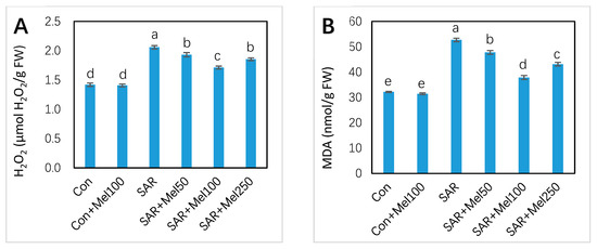 Accumulation of (A) H2O2 and (B) MDA concentration in tomato leaves by SAR and/or melatonin treatments. Data indicate here the mean of four replications. Vertical bars indicate the standard error. Means not sharing a common letter within the graph are significantly different at p ≤ 0.05 according to Tukey’s test.