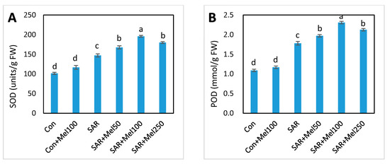Activities of many antioxidant enzymes and nonenzymes are enhanced in plants to eliminate ROS when plants are subjected to stress [41,42]. With the agreement of other results [13,39], our findings showed that different enzymatic antioxidant compounds such as SOD, POD, CAT, and APx and nonenzymatic antioxidant compounds such as phenolics, flavonoids, and proline were increased to protect against ROS damage by SAR treatment (Figure 6 and Figure 7A–C). In addition, it was observed that exogenous melatonin application in SAR-stressed plants serving as a signal molecule by further increasing these ROS-scavenging antioxidant compounds to enhance defense system compared with SAR-alone treated plants, resulting in the mitigation of oxidative damage (Figure 6 and Figure 7A–C). Moreover, the findings our experiments showed that the activities of these enzymes and nonenzymes enhanced by melatonin treatment in SAR-stressed plants could confer SAR-stress tolerance in tomato plants to some extent. These consequences supported the concept that melatonin may have a vital role in protecting the plants from any abiotic stress conditions and in overcoming damage from oxidative stress at the plant’s cellular level [23,25].