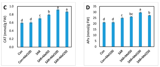 Changes of enzymatic antioxidant activities in tomato leaves by SAR and/or melatonin treatments. (A) SOD; (B) POD; (C) CAT; (D) APx. Data indicates here the mean of four replications. Vertical bars indicate the standard error. Means not sharing a common letter within the graph are significantly different at p ≤ 0.05 according to Tukey’s test.