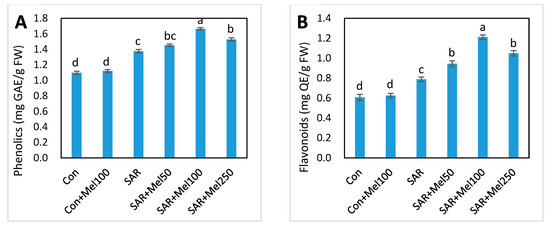 In the current study, the total antioxidant activities were determined by ferric-reducing antioxidant power (FRAP) in the leaves of the tomato plant. It was observed that the total antioxidant activities of the plant was partly associated to the ferric-reducing capacity of the bioactive compound [43], and the free radical scavenging activities of phenolics and flavonoids might be related to the reducing antioxidant capacity of plants [44]. Our results showed that the ferric reducing antioxidant activity increased by all doses of melatonin treatment in SAR-stressed plants compared with those in the SAR-alone treatment (Figure 7D). Meanwhile, in agreement with other results [33], current findings evident that melatonin boosted the SAR-stresst tolerance of plants by inducing their antioxidant activities.