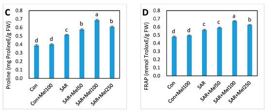 Changes of nonenzymatic and total antioxidant activities in tomato leaves by SAR and/or melatonin treatments. (A) phenolics; (B) flavonoids; (C) proline; (D) FRAP (Ferric reducing antioxidant power) values. Data indicates here the mean of four replications. Vertical bars indicate the standard error. Means not sharing a common letter within the graph are significantly different at p ≤ 0.05 according to Tukey’s test.