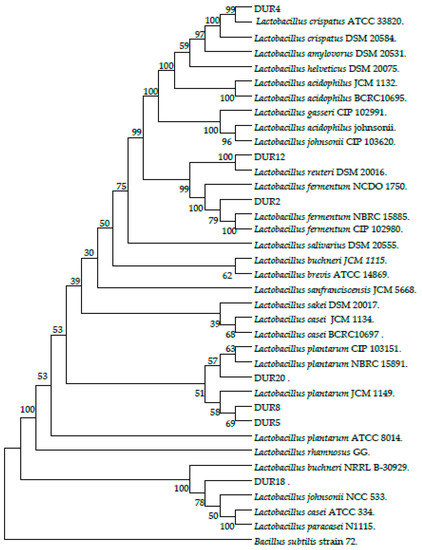 Forty-four isolates out of 100 showed the typical features of LAB (rod-shaped, Gram-positive, and catalase negative). Seven isolates were chosen for further evaluation of their probiotic characteristics according to a preliminary screening for low pH and bile salt tolerance using optical density (OD) values (data not shown). As presented in Table 1, identification of the isolates using carbohydrates fermentation profile and 16S rRNA gene sequence (99–100% similarity) indicated that the seven strains belonged to five different species of the genus Lactobacillus, including one L. fermentum (DUR18), three L. plantarum (DUR2, DUR5, DUR8), one L. reutri (DUR12), one L. crispatus (DUR4), and one L. pentosus (DUR20). Based on 16S rRNA gene sequences, a phylogenetic relationship between the seven isolates and the reference strains obtained from the GeneBank (29 nucleotides) was constructed to indicate the species and distribution of the selected isolates (Figure 1).