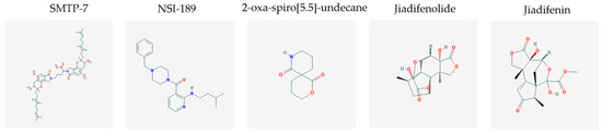 Stroke is a neurological disorder commonly associated with a very high mortality and disability rate, for which the only existing therapeutic opportunity consists in the use of a thrombolytic agent in order to restore the blood flow in the ischemic area [76]. However, only a limited number of subjects can benefit from this pharmacological intervention. Therefore, there is an urgent need to develop new therapeutic strategies. In this context, the potential use of small molecules, as possible pharmacological choice, has become a field of lively scientific research. In particular, the therapeutic effects of the small molecule Stachybotrys microspora triprenyl phenol-7 (SMTP-7), that promotes activation of plasminogen through the modulation of plasminogen conformation [77], against cerebral ischemia has been tested in several rodent models of stroke [78,79,80]. Importantly, together with its strong thrombolytic properties, SMTP-7 has been also described as a decrease of neuroinflammation related to stroke-induced neurodegeneration [78,81]. Despite the utility of data obtained on rodent models of stroke regarding this small molecule, studies in higher-order species, such as primates, whose cerebral vascularization and vessel morphology show more significant similarities with the human counterpart than rodents [82], can be considered extremely significant for a more direct translation towards the human pathology and for a potential clinical application of SMTP-7. In this perspective, the study conducted by Sawada and co-workers appears of great importance. Indeed, authors succeeded in demonstrating in primates, by using the photochemically induced thrombotic middle cerebral artery occlusion model, causing cyclic flow reductions typical of infarct progression in stroke patients, that SMTP-7 reduced cerebral infarction, neurologic deficits, and hemorrhage in the infarct area, thus also displaying a significant neuroprotection [83]. Neuroprotective effects of small molecules against stroke-associated neurodegeneration, especially in terms of neurostructural benefits and enhancement of neurogenesis, have been also clearly reported in a recent elegant work that evaluated the effects of an oral administration of the small molecule NSI-189, which is already in clinical trial for the treatment of major depression and prevention against suicide (https://clinicaltrials.gov/) [84], in the middle cerebral artery occlusion mouse model [85]. Thanks to a well-conceived experimental approach, authors were able to demonstrate that NSI-189 promoted behavioral recovery, enhanced cell proliferation and neurogenesis, and upregulated specific neurogenic factors, such as BDNF, if administered at a wider therapeutic window of 6 hours after stroke [85]. Although no data on the effects of this small molecule on primate models of stroke are currently available, results obtained on the mouse model, could be certainly considered very promising in the perspective of approving this small agent also for the treatment of stroke in humans. Another promising category of pharmacological compounds which recently raised interest in the research of novel therapeutic options for stroke and associated neurodegeneration is represented by natural product-based small molecules with neurotrophic, neurogenic and anti-neuroinflammatory actions. Recent efforts in this direction by the group of Jhelum and collaborators led to the discovery of some novel compounds based on 2-oxa-spiro[5.5]-undecane, derived from the natural product paecilomycine A, which have been described as booster of neurite growth and neuronal regeneration, and as a neuroinflammation decreaser [86,87]. Other natural small molecules, such as jiadifenolide, jiadifenin and (1R,10S)-2-oxo-3,4-dehydro-xyneomajucin (ODNM), have been also tested in vitro for their neuritogenic and neurotrophic activity, by using primary rat hippocampal neurons and ESC-derived motor neurons [88] or PC12 cells [89]. The chemical structures (https://pubchem.ncbi.nlm.nih.gov/) [17] of small molecules with therapeutic potential for stroke-related neurodegeneration are shown in Figure 3.