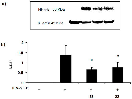 Figure 2. Effects of 22 and 23 on NF-κB expression. (a) Representative blot; (b) Nuclear Factor-kappa B (NF-κB) levels in cultures of human keratinocytes stimulated with IFN-γ and histamine (H), 48 h after the addition of compounds 22 and 23 at 10 µM concentrations, determined by Western blot analysis. Data show the relative expression (mean ± SEM) of NF-κB, calculated as arbitrary densitometric units (A.D.U.), from three independent experiments. * p < 0.05, compared with respective IFN-γ and H.