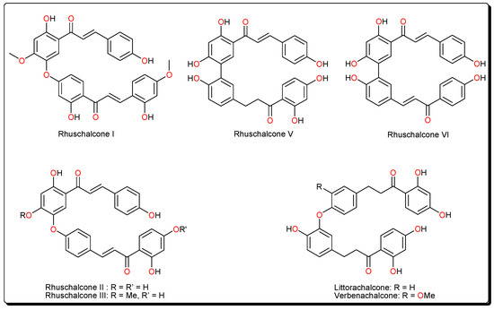 - Mdee, L.K.; Yeboah, S.O.; Abegaz, B.M. Rhuschalcones II-VI, five new bichalcones from the root bark of Rhus pyroides. J. Nat. Prod. 2003, 66, 599–604. [Google Scholar] [CrossRef] [PubMed]