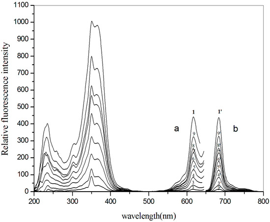 Excitation (a) and emission (b) of AlS4PC-Alcian blue 8GX in the presence of Hg(II) in an aqueous medium with a pH of 5.0. 1-1’. Buffer + AlS4Pc, [AlS4Pc] = 1.0 × 10−6 mol/L, [EDTANa2] = 1.0 × 10−4 mol/L. 2-2’. Buffer + AlS4Pc + Alcian blue 8GX, [AlS4Pc] = 1.0 × 10−6 mol/L, [Alcian blue 8GX] = 1.50 × 10−6 mol/L, [EDTANa2] = 1.0 × 10−4 mol/L; 3-3’, 4-4’, 5-5’, 6-6’, 7-7’, 8-8’, 9-9’. Buffer + AlS4Pc + Alcian blue 8GX + Hg(II), [AlS4Pc] = 1.0 × 10−6 mol/L, [Alcian blue 8GX] = 1.50 × 10−6 mol/L, [EDTANa2] = 1.0 × 10−4 mol/L, concentrations of Hg(II) for curves 3–9 and 3’–9’: 0.2, 0.4, 2.0, 10.0, 50.0, 100.0 and 200.0 µmol/L, respectively.
