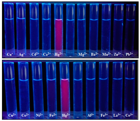 Naked-eye observation of the fluorescence recovery for AlS4PC-Alcian blue 8GX in the presence of different metal ions including Hg(II) in an aqueous medium. The concentration of AlS4Pc was 1.0 × 10−6 mol/L, Alcian blue 8GX was 1.50 × 10−6 mol/L and EDTANa2 was 1.0 × 10−4 mol/L. The concentration of all of the metal ions added was 1.0 × 10−4 mol/L.