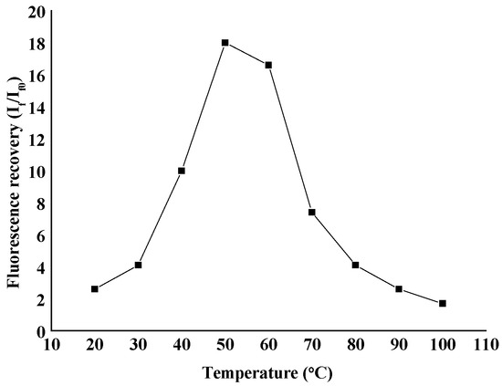 The effect of reaction temperature on the fluorescence quenching and recovery of the reaction system was investigated. It was found that the degree of fluorescence quenching dropped with an increase in the temperature, indicating that this quenching system involves a static quenching process (static quenching constant decreases with an increase in temperature). In the range of 20~100 °C, the fluorescence recovery increases at first and then decreases with an increase in temperature. The fluorescence recovery of the system reached the maximum at 50 °C (Figure 6), due to which the reaction temperature was set at 50 °C.