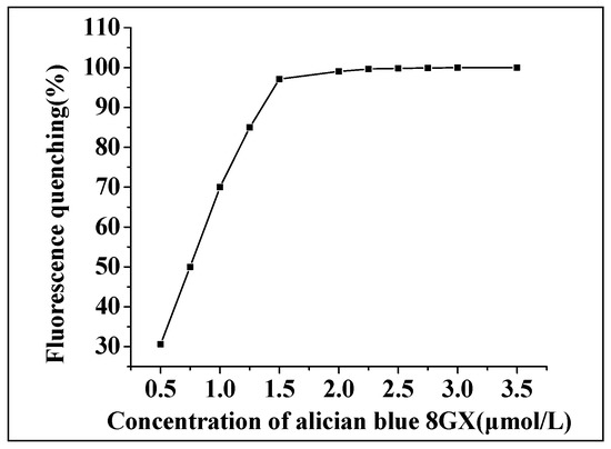 Under the given concentration (1.0 × 10−6 mol/L) of AlS4Pc and other optimized conditions, the effects of different concentrations of Alcian blue 8GX on the fluorescence quenching (Figure 8) and recovery of the reaction system were investigated. The other conditions remained the same. It was found that as the concentration of Alcian blue increased, the degree of quenching of fluorescence gradually increased until reaching a platform where the quenching value was close to 100%. The results demonstrated that the relative fluorescence intensity of the system increased at first and then decreased with a gradual addition of Alcian blue, and the relative fluorescence intensity reached the maximum when Alcian blue was at 1.50 μmol/L. Therefore, based on the inflection point of the fluorescence quenching curve and the recovery condition of the system, the dosage of Alcian blue was determined to be 1.50 μmol/L.