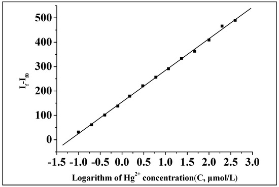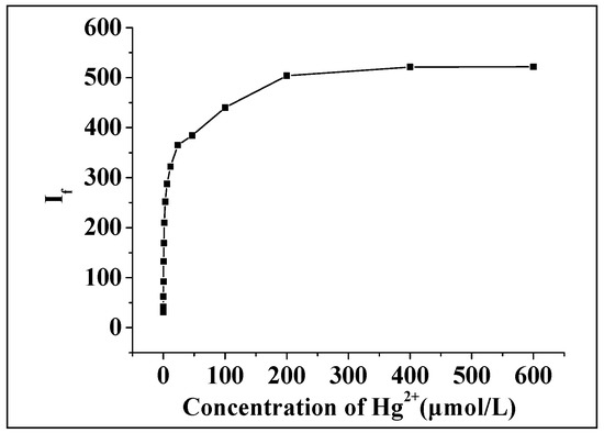 Under the optimal conditions, the fluorescence intensity of the system in the presence of different concentrations of Hg(II) was measured. It was found that the fluorescence intensity at first increased and then remained constant with an increase in the concentration of Hg(II) (Figure 9). A further mathematical analysis showed that the logarithm of the relative fluorescence intensity (ΔIf = If − If0) to Hg(II) concentration showed a good linearity within a certain order of concentration range (Figure 10). The linear regression equation (calibration curve) was obtained by plotting the logarithmic value (lgC) of the concentration of Hg(II) (C, μmol/L) to the restored relative fluorescence intensity (ΔIf = If − If0), which showed ΔIf = 154.82 + 129.71lgC, where r = 0.9994, the linear range was 0.1–400 μmol/L, and the detection limit was 0.0104 μmol/L.