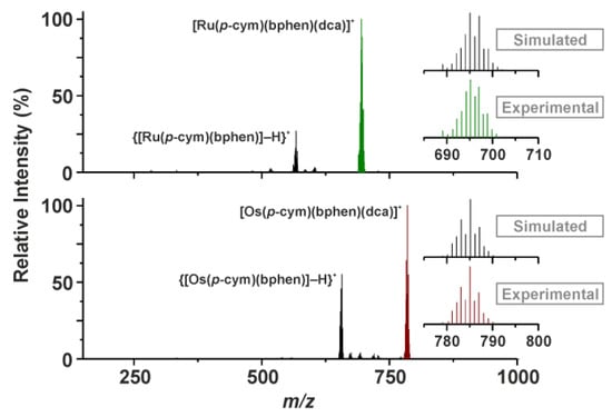 The ESI+ mass spectra of complexes Ru-dca and Os-dca contained the peaks of 100% relative intensity, belonging to the complex [M(pcym)(bphen)(dca)]+ cations (Figure 2), which directly proved the formation of complexes Ru-dca and Os-dca from the Ru-Cl and Os-Cl starting compounds. Further, the peaks, assignable according their m/z values and isotopic distribution to the {[M(pcym)(bphen)]–H}+ species, were detected in the mass spectra of both complexes Ru-dca and Os-dca (Figure 2).