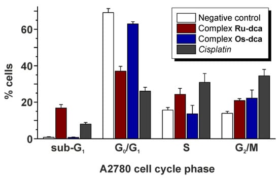 The Ru-dca and Os-dca complexes modified the cell cycle of the A2780 human ovarian carcinoma cells differently, when applied at equipotent (IC50) concentration (Figure 5, Table 2). In particular, the Ru-dca complex strongly increased the sub-G1 cell population (16.8% of cells) as comparted to the Os-dca complex (0.7% of cells). The increase in the sub-G1 population is often connected with the appearance of late-apoptotic and necrotic cells. Simultaneously, the Ru-dca complex caused the decline in the G0/G1 cell cycle phase population (37.0% of cells) as compared with the negative control (69.2% of cells) as well as with complex the Os-dca complex (62.9% of cells). In the S-phase, the effect of the Ru-dca complex is much closer to that of cisplatin (24.3% vs. 30.9% of cells) as compared with the Os-dca complex (13.6% of cells). In the G2/M cell phase, both the complexes showed the similar effect (20.9% vs. 22.2% of cells). Overall, the results of cell cycle modifications revealed that the cellular effects of the Ru-dca complex are much more similar to the effects of cisplatin, while the Os-dca complex showed only a small effect on the cell cycle in the A2780 cells as compared to the negative control. Just for the comparative purposes we may show that similar human cancer cell cycle perturbations were recently reported for half-sandwich complexes [Ru(η6-pcym)(L2)Cl] and [Os(η6-pcym)(L2)Cl] containing 1-(4-methoxybenzyl)-4-phenyl-1H-1,2,3-triazole (HL2) [38].