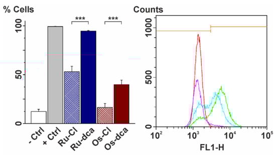 (Left) The results of the flow cytometry studies of cytochrome c release at the A2780 cells treated for 24 h by the IC50 concentrations of complexes Ru-Cl (dashed blue), Ru-dca (blue), Os-Cl (dashed red) and Os-dca (red); white = negative control (−Ctrl), grey = positive control (+Ctrl), p < 0.005 (***). (Right) The representative histogram of the flow cytometry studies of cytochrome c release, showing the fluorescence intensities in FITC-H channel in the A2780 cells treated by complexes Ru-dca (pink) and Os-dca (blue), given together with the negative (green) and positive (red) controls. Orange line segments show the edge between low and high fluorescence populations.