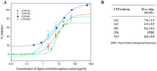 The impact of an aqueous extract of the dried aerial plant on the activities of a number of CYP enzymes was investigated, and a summary of the results shown in Figure 1A,B. Best-fit non-linear plots were fitted to the data points using the 4-parameter logistic (4PL) non-linear regression model (SigmaPlot) and IC50 values determined for four of the five enzymes tested. The aqueous extract of H. verticillata potently inhibited the activity of all four enzymes, with the concentration needed to inhibit 50% of activity, IC50 values all being under 10 µg/mL: CYPs 1A2 (1.9 µg/mL), 1A1 (7.6 µg/mL), 1B1 (9.4 µg/mL) and 3A4 (6.8 µg/mL). It was not possible to measure the aqueous extract’s impact on CYP2D6 due to a high level of background fluorescence produced by the extract (Figure 1A,B).