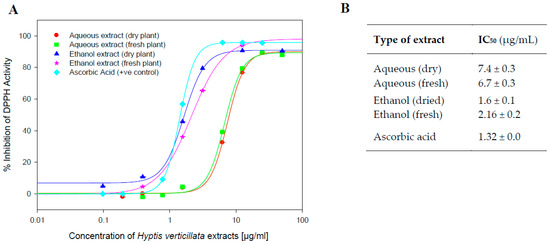 The 1,1-diphenyl-2-picrylhydrazyl (DPPH) assay was used to measure the antioxidant capacity of four different extracts of the aerial parts of H. verticillata (Figure 2). The reduction of DPPH to hydrazine produces a colour change from purple to yellow, which is measured spectrophotometrically and compared with the known antioxidant, ascorbic acid, as described in the Materials and Methods section.