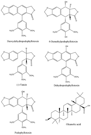 The fifteen LC-MS spectral results cross-referenced with data from the RP-HPLC analysis using standards (Table 1) (Appendix A, Figure A1 and Figure A2 & Appendix B, Table A1) confirmed the presence of five lignans, deoxydehydropodophyllotoxin, 4′-demethylpodophyllotoxin, (-)-yatein, dehydropodophyllotoxin and podophyllotoxin (Table 1, Figure 3). RP-HPLC analysis with standards alone, confirmed the presence of one further phytochemical, the triterpene oleanolic acid (Table 1, Figure 3) (Appendix A, Figure A2 and Appendix B, Table A1).
