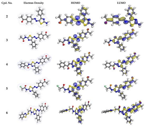 The electron density, the HOMO and LUMO frontier orbitals of 5-(4-acetylphenylazo) thiazoles 2, 3, 4, 5 and 6.