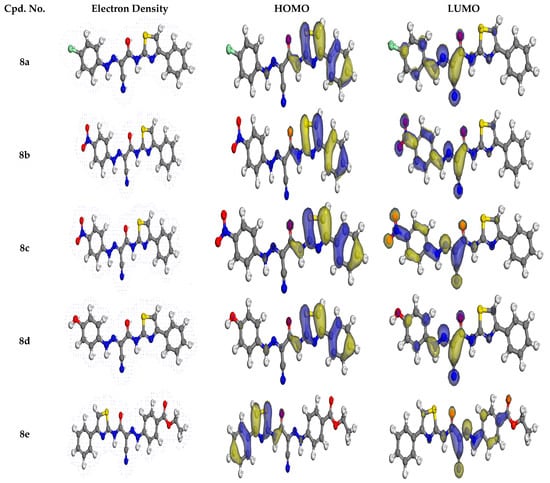 The electron density, the HOMO and LUMO frontier orbitals of N-(thiazol-2-yl)-2-arylhydrazono-2-cyanoacetamides 8a–e.