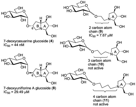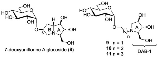 In consideration of the high number of steps required for the synthesis of pseudodisaccharides bearing the pyrrolizidine nucleus such as compounds 3–5 and 8 itself, we also wanted to explore the insect trehalase activity of simpler pseudodisaccharide inhibitors 9–11, that bear the glucose unit linked to the pyrrolidine DAB-1 instead of the pyrrolizidine nucleus. DAB-1 actually has the same structure of ring A of the pyrrolizidine nucleus (Figure 2), and we had previously verified that it is able to mimic glucose by imparting trehalase inhibition in pseudodisaccharide mimetics [8,9]. The aim of the present work was to link the DAB-1 moiety to the glucose moiety through a linker of variable length (2, 3 and 4 carbon atoms), in order to verify which was the more appropriate tether length (Figure 2) for trehalase inhibition.