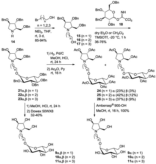Pyrrolidine 14 was N-alkylated with an excess of 2-bromo-1-ethanol, 3-bromo-1-propanol and 4-bromo-1-butanol in THF, using Et3N as the base at room temperature, affording alcohols 15 (85% yield) [12], 16 (94% yield) and 17 (88% yield), with a free hydroxyl group at the end of the aliphatic chain, thus allowing selective glucosylation at this position (Scheme 3).